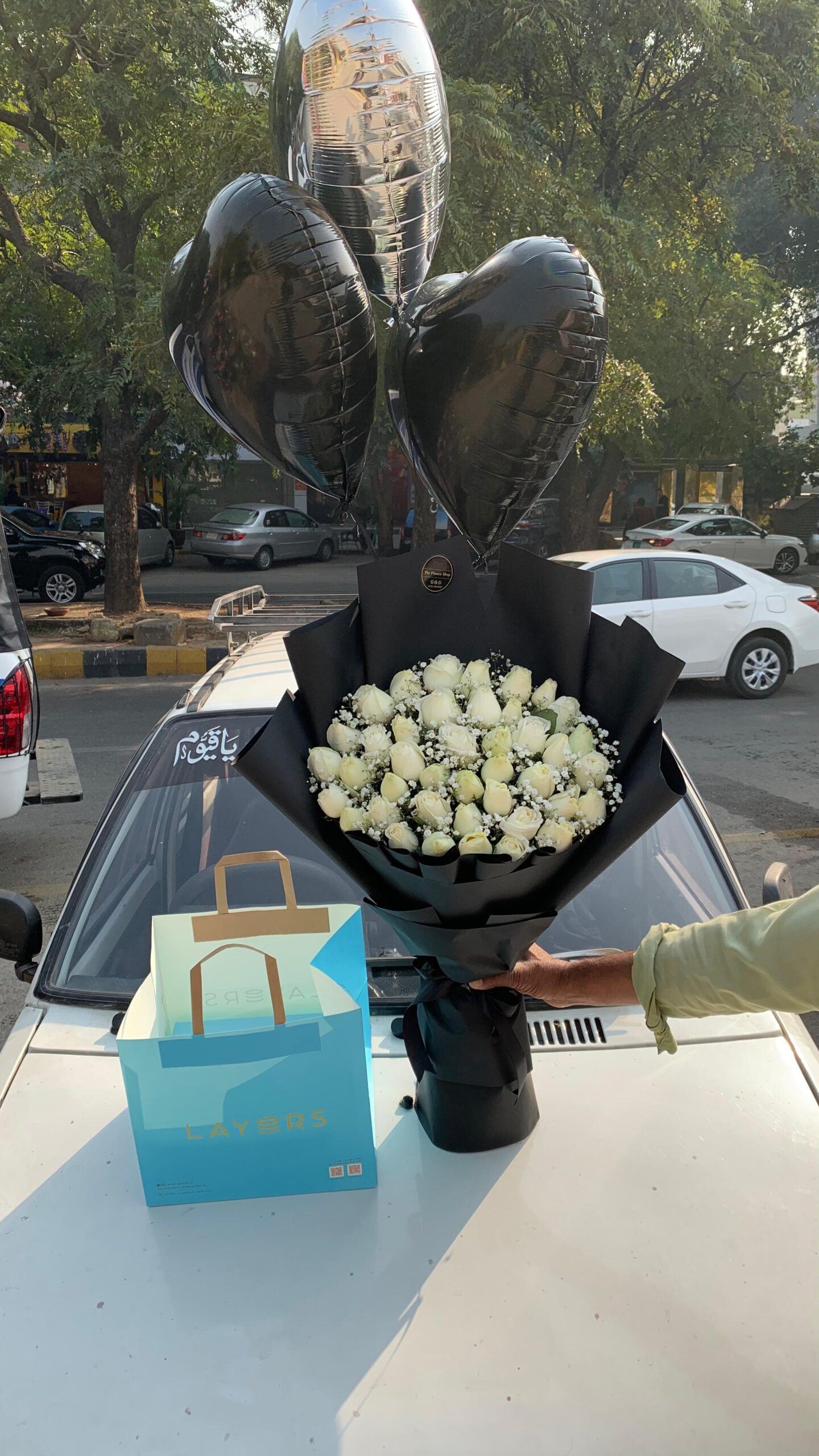 A luxurious combo featuring 40 white premium short-stem roses arranged in elegant one-side black packing, enhanced with soft baby’s breath for a classy, minimal look. Paired with a delicious Milky Malt Cake from Layer’s and 3 balloons — 1 silver and 2 black — perfect for birthdays, celebrations, and surprise gifting.