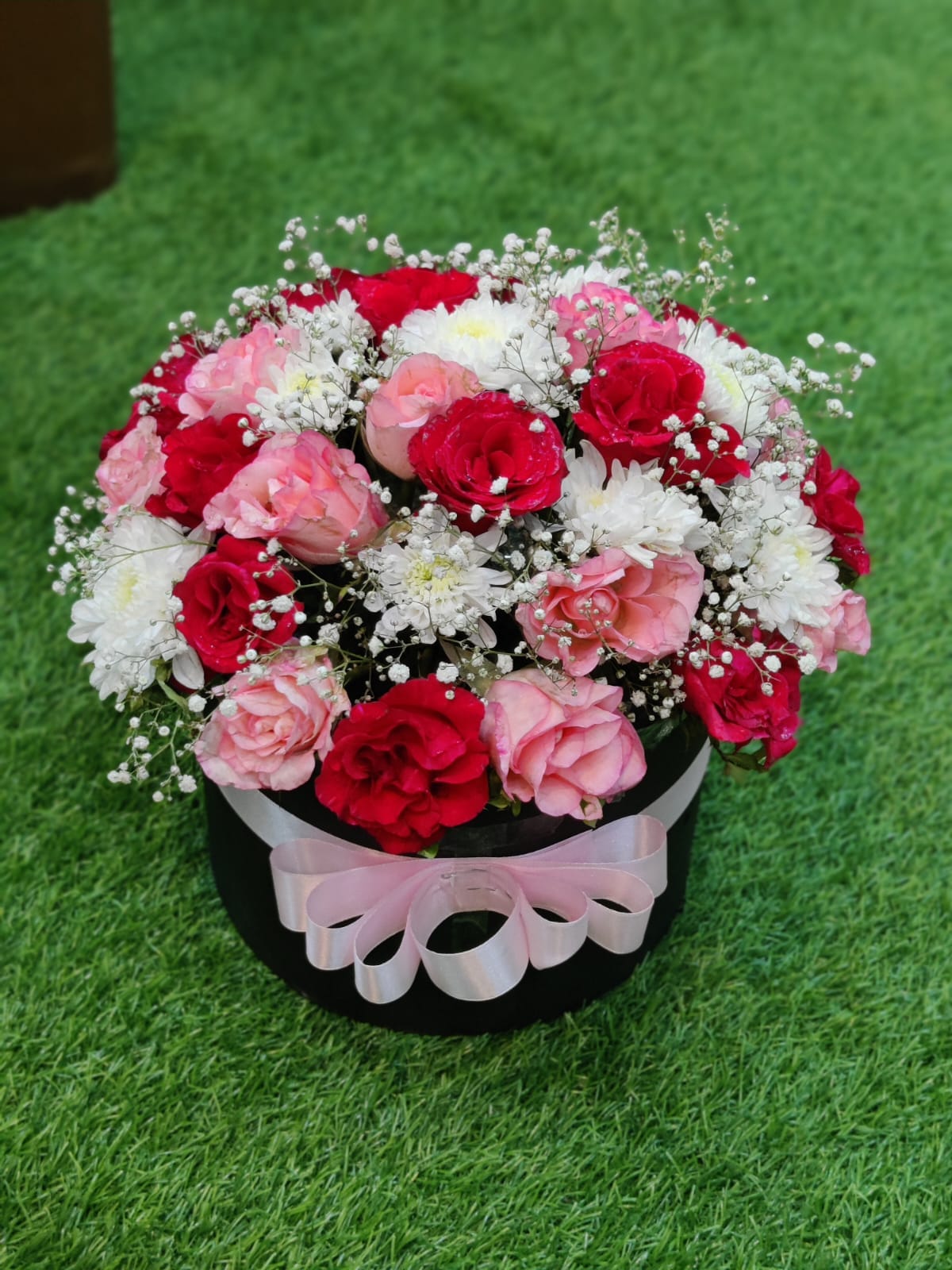 A stylish black box arrangement featuring a beautiful mix primum pink and red roses, complemented with fresh white chrysanthemums and delicate baby’s breath. A classy and elegant floral box—perfect for gifting and special occasions.