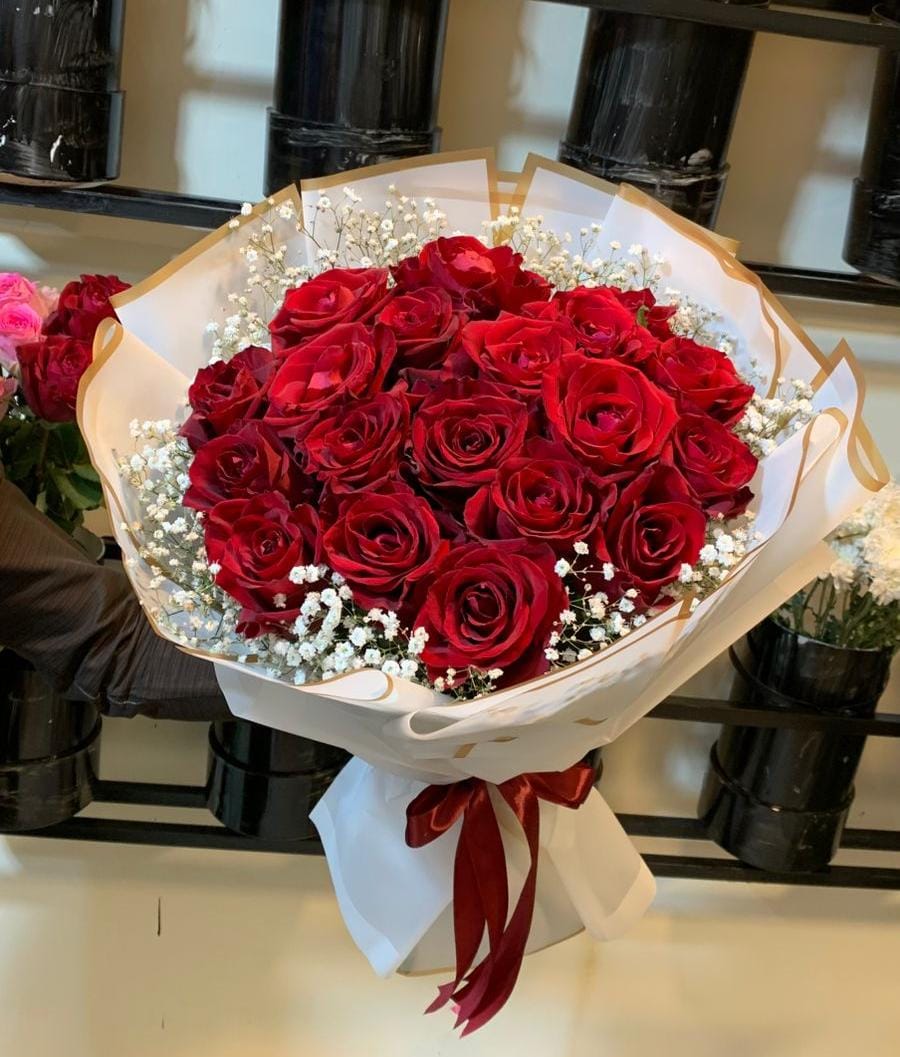 A luxurious round-shaped bouquet featuring 20 imported red roses with fresh baby breath, wrapped in elegant white premium packing — perfect for gifting on birthdays, anniversaries, surprises, romantic occasions, and special events. Available for same-day delivery in Islamabad and Rawalpindi.