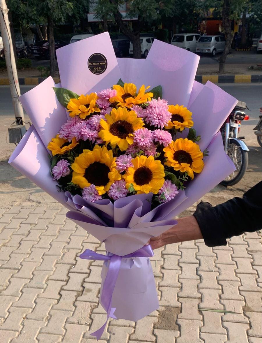 A beautiful hand-tied bouquet featuring 8 fresh sunflowers paired with 2 stems of chrysanthemums, carefully wrapped in elegant purple wrapping. This vibrant arrangement is perfect for brightening someone’s day, expressing gratitude, or celebrating a special moment.