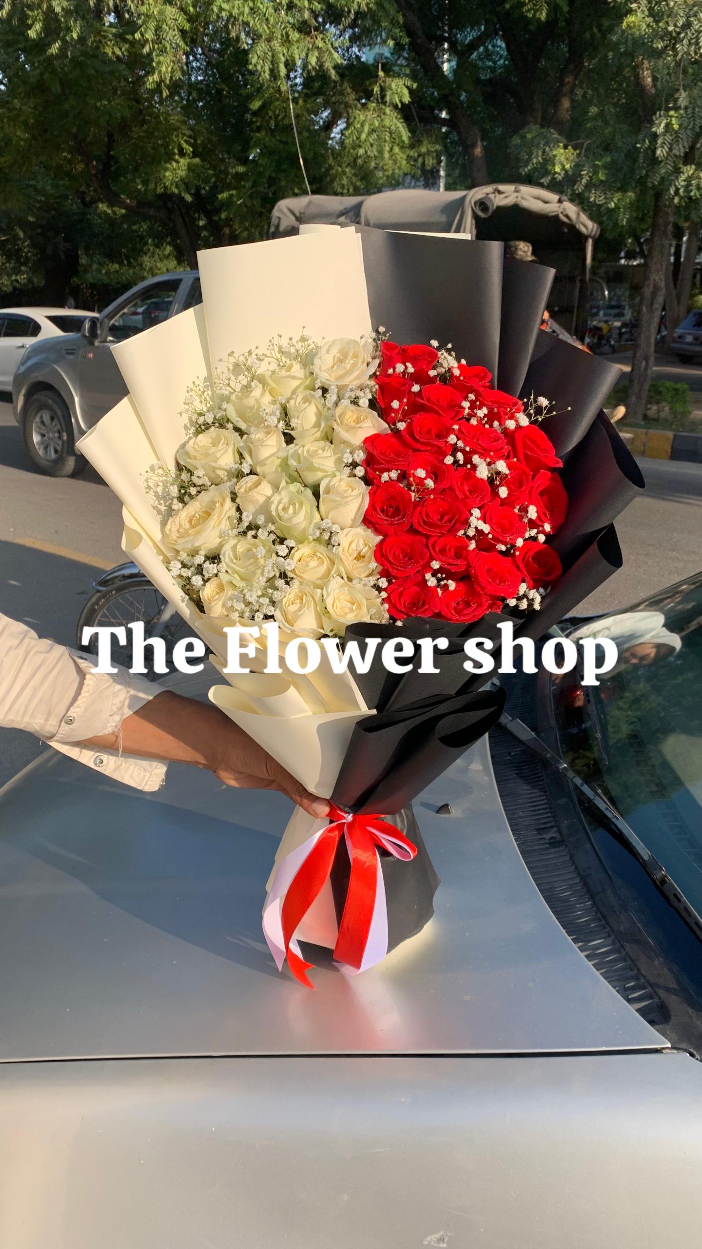 A premium bouquet crafted with 30 red and 30 white short stem roses, arranged beautifully with baby breath. Wrapped in elegant black and off-white one-side packing, giving it a stylish and luxurious finish. Perfect for anniversaries, surprises, and special occasions.